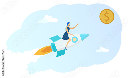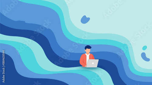 Векторный плакат концепции успеха в бизнесе в стиле оригами из бумаги. Бизнесмен, занимающийся серфингом на вершине волны. Морские волны и облака вырезаны из бумаги.