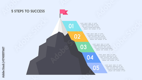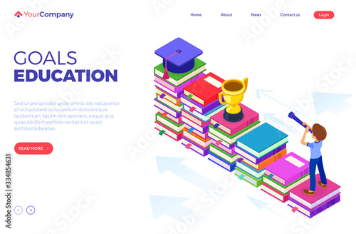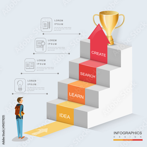 Шаблон веб-баннера успеха в бизнесе. Векторная изометрическая гистограмма роста лестница с планом идеи, словами команды и времени и кубком для награждения трофеями наверху. Четыре шага к успешной бизнес-концепции.