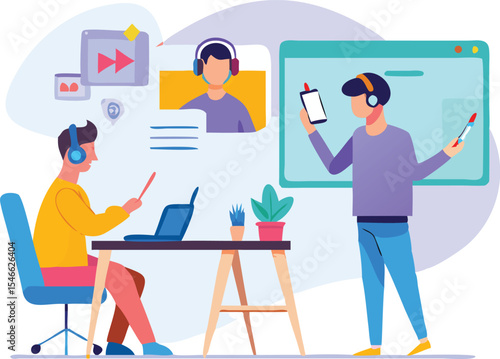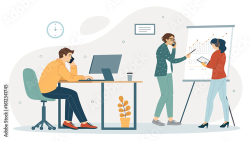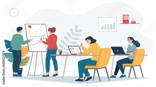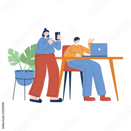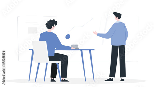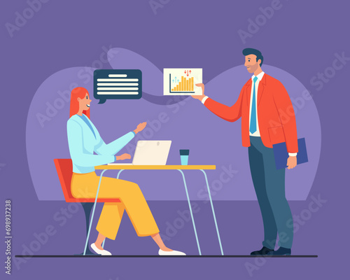 Деловые люди мужчина и женщина обсуждают идею, обсуждают, векторная плоская изолированная иллюстрация. Офисная сцена бизнес-команды, обсуждение, концепция командной работы для веб-баннера, страницы веб-сайта и т.д.