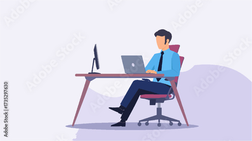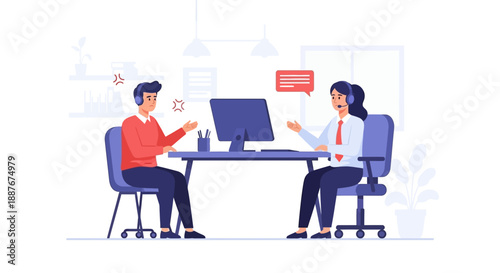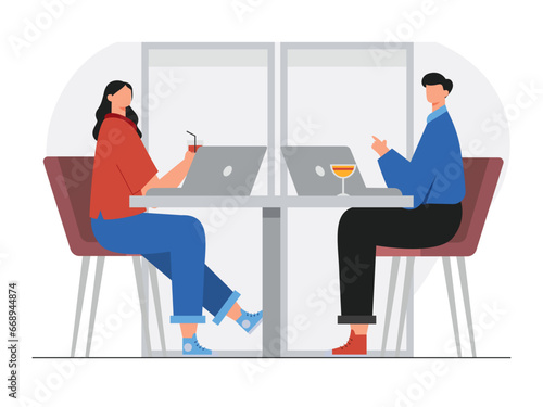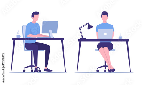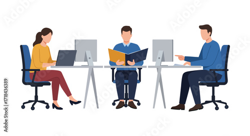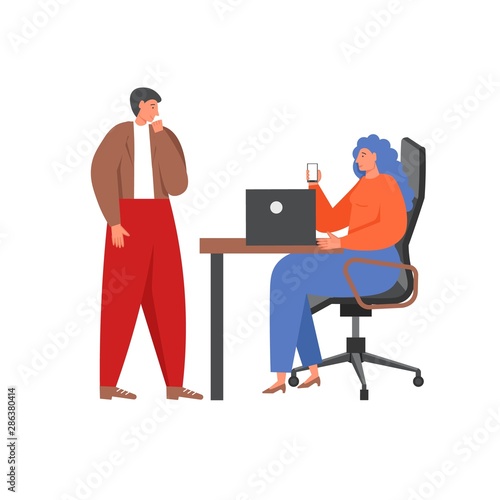 Бизнесмен, работающий бок о бок с бизнесвумен, векторная плоская изолированная иллюстрация. Офисная сцена бизнес-команды, командная работа, концепция рабочего места для веб-баннера, страницы веб-сайта и т.д.