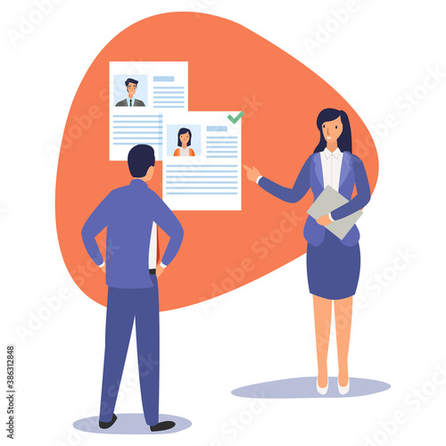 Деловые люди мужчина и женщина читают лекцию, векторная плоская изолированная иллюстрация. Офисная сцена бизнес-команды, коучинг, конференция, встреча, образовательная концепция для веб-баннера, страницы веб-сайта и т.д.