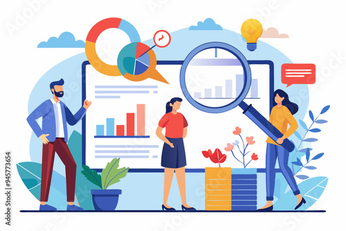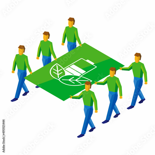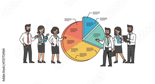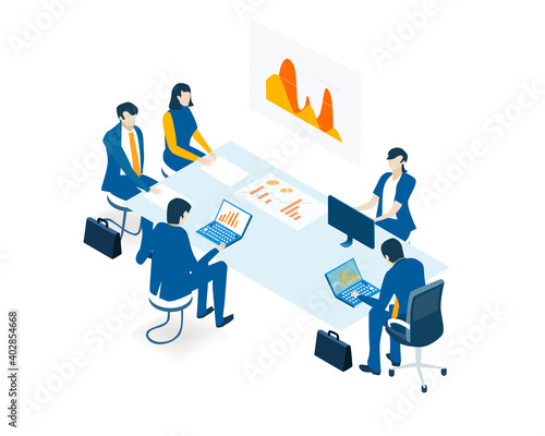 Бизнес-команда вместе создает круговую диаграмму лампочки, плоскую векторную изометрическую иллюстрацию. Командная работа, сотрудничество, партнерство, коллаборация.