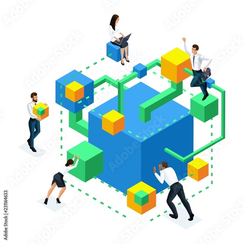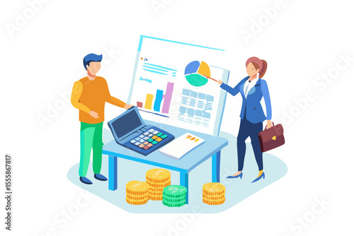 Бизнес-команда вместе создает круговую диаграмму лампочки, плоскую векторную изометрическую иллюстрацию. Командная работа, сотрудничество, партнерские отношения, коллаборация.