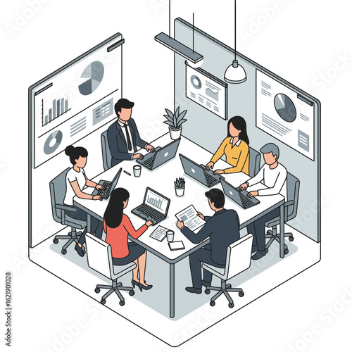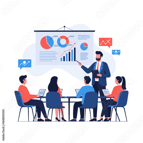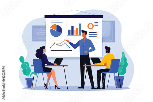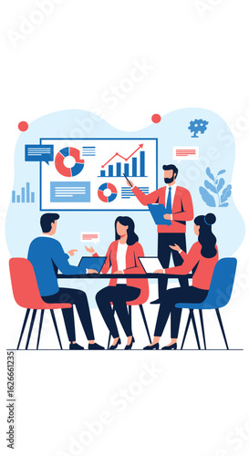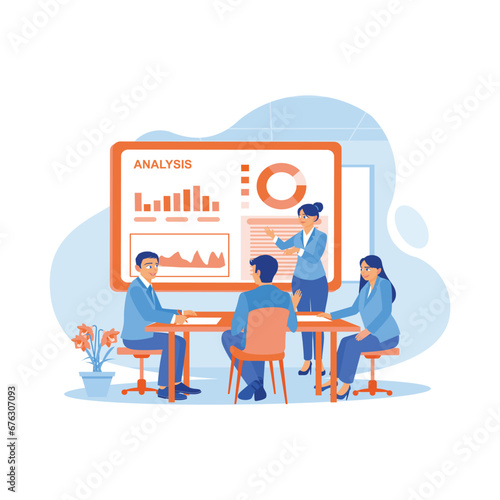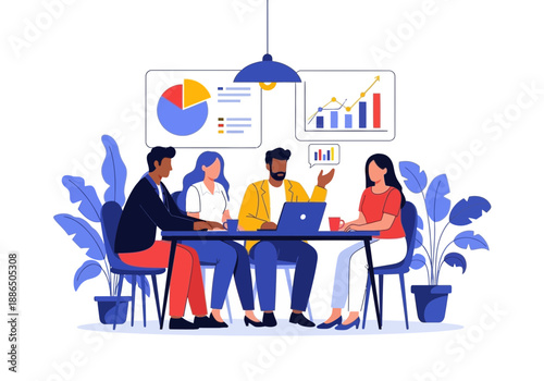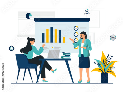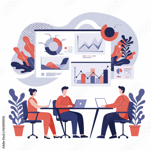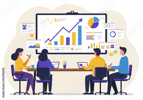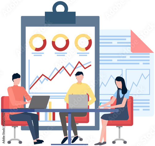 Векторная иллюстрация большой статистической панели с увеличивающейся гистограммой и стрелкой, крошечные офисные люди работают вместе, взаимодействуя с диаграммами. Концепция бизнес-команды для веб-баннера, страницы веб-сайта.