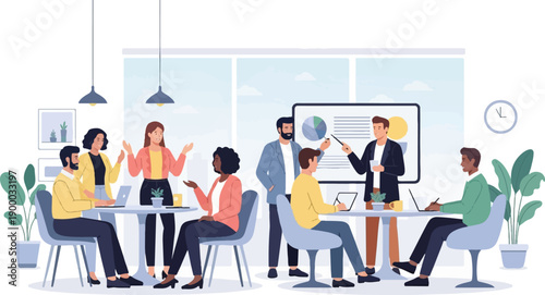 Офисная команда, плоская векторная иллюстрация. Деловые люди встречаются, пожимают друг другу руки, заключают сделку, звонят по видеосвязи, пьют кофе. Командная работа, партнерство. Офисные ситуации.
