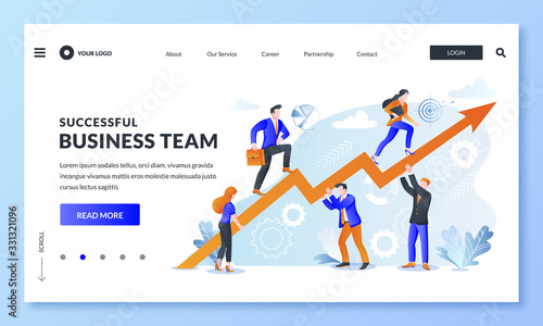 Векторный шаблон веб-сайта бизнес-команды, дизайн веб-страницы и целевой страницы для разработки веб-сайтов и мобильных сайтов. Деловые люди тянут долларовую монету на веревке.