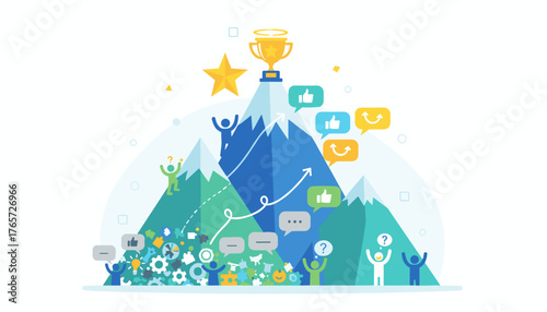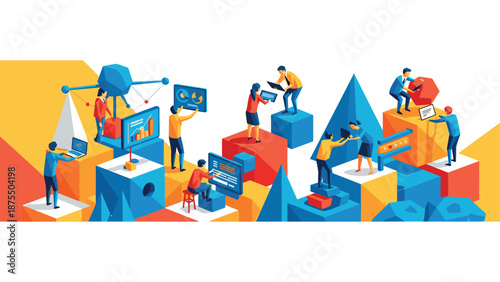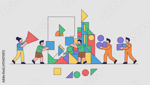 Векторная плоская иллюстрация концепции командной работы. Группа людей вместе строит подиум-головоломку для достижения общей цели. Сотрудничество и концепция совместной работы.