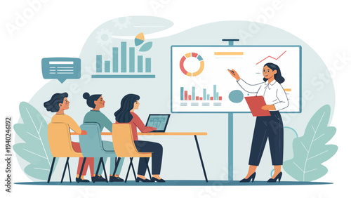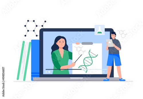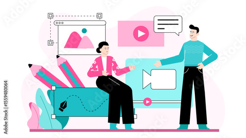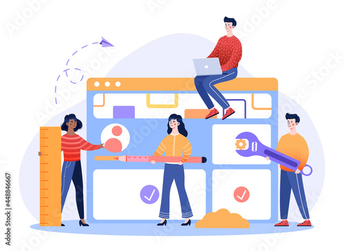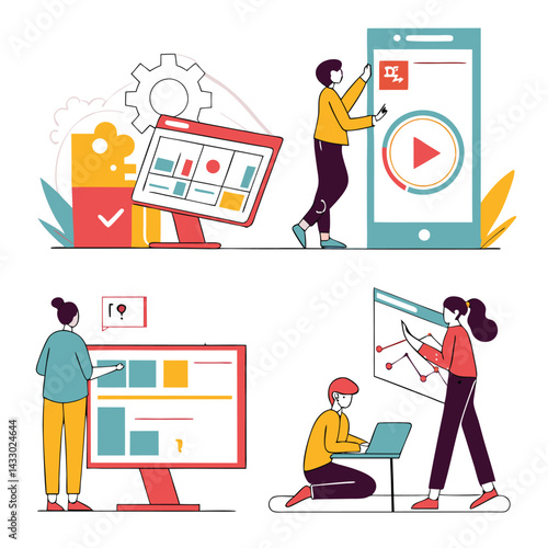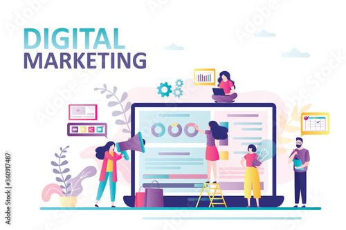 Векторная иллюстрация большого монитора компьютера с панелью статистики, крошечные люди отправляют текстовые сообщения, делают перерыв на кофе, разговаривают друг с другом. Концепция процесса бизнес-процесса для веб-баннера, страницы.