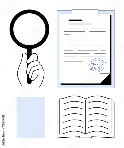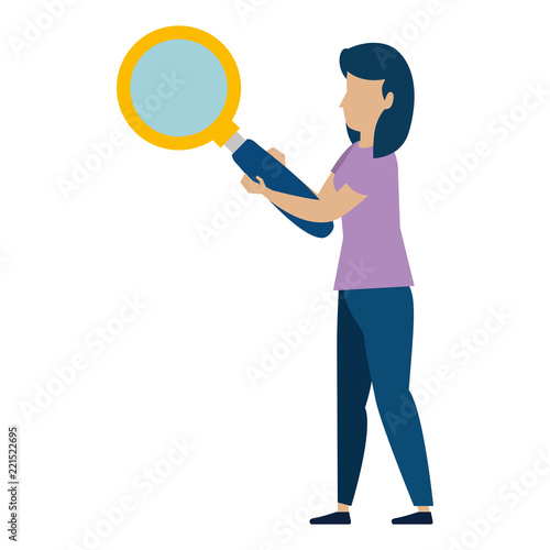 Деловая женщина с векторной иконкой в виде увеличительного стекла. Девушка проводит исследование и ищет информацию, используя лупу, выделенную на белом фоне