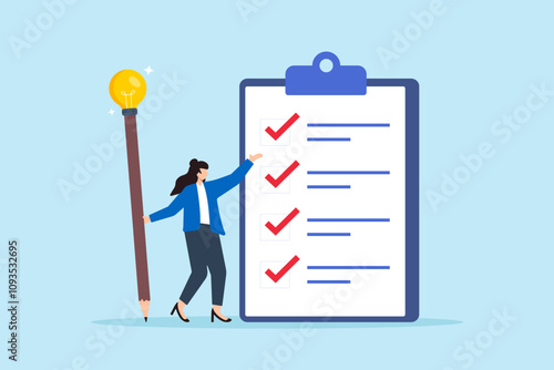 Бизнесмен, добавляющий галочку в список дел с задачами в буфере обмена, плоская векторная иллюстрация. Управление задачами, планирование, составление расписаний.
