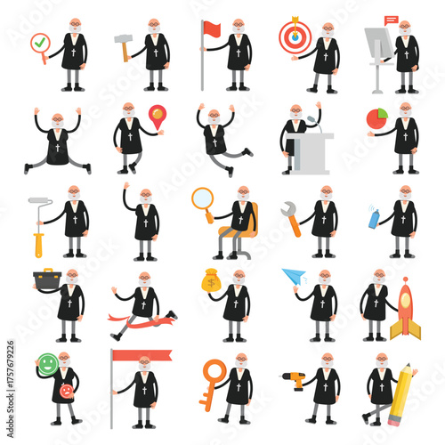 Группа офисных людей в различных деловых ситуациях и позах, демонстрирующих жесты руками. Векторная иллюстрация, изолированная на белом фоне. Набор иконок мультяшного персонажа бизнесмена.