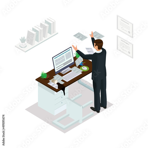 Бизнесмен, выбирающий компанию по доставке грузов и логистике, плоская векторная изометрическая иллюстрация. Выбор транспортных средств. Доставка грузов морским, воздушным, автомобильным транспортом.