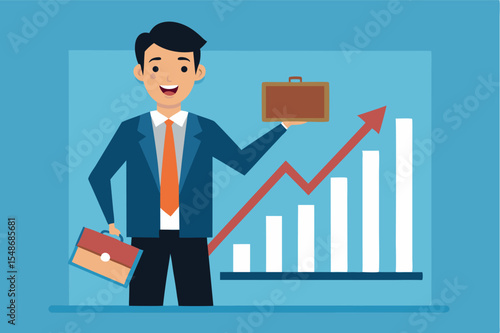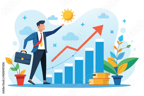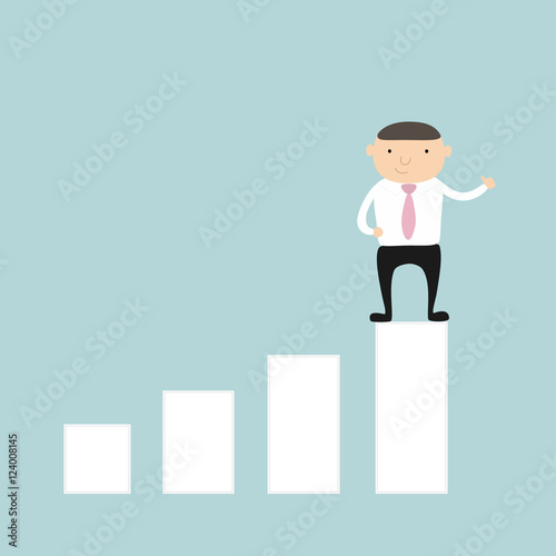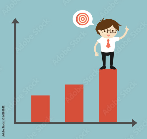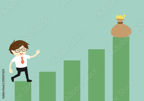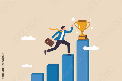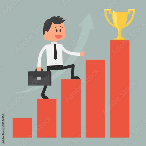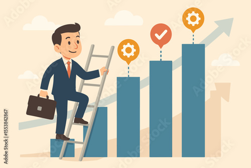 Бизнесмен, поднимающийся по лестнице к успеху. Достижение цели. Концепция мотивации и цели для достижения успеха в бизнесе и жизни. Векторная иллюстрация в плоском дизайне.