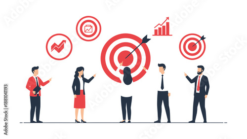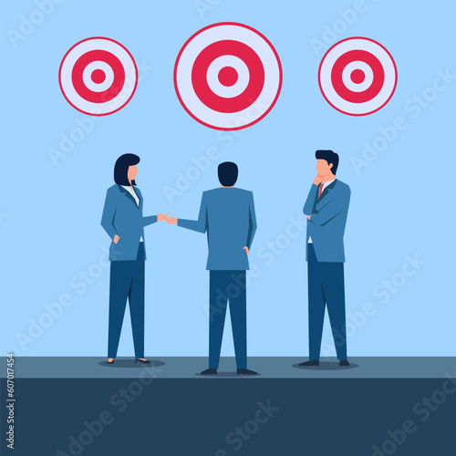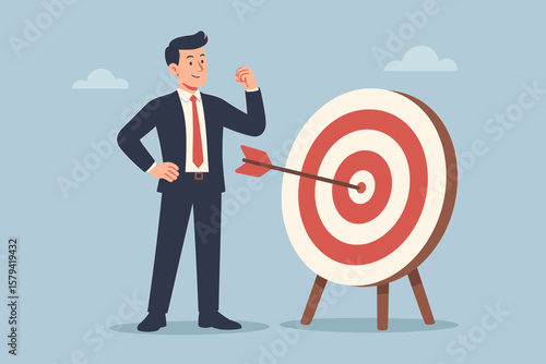 Бизнесмен, поднимающийся по лестнице к успеху. Достижение цели. Концепция мотивации и цели для достижения успеха в бизнесе и жизни. Векторная иллюстрация в плоском дизайне.