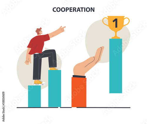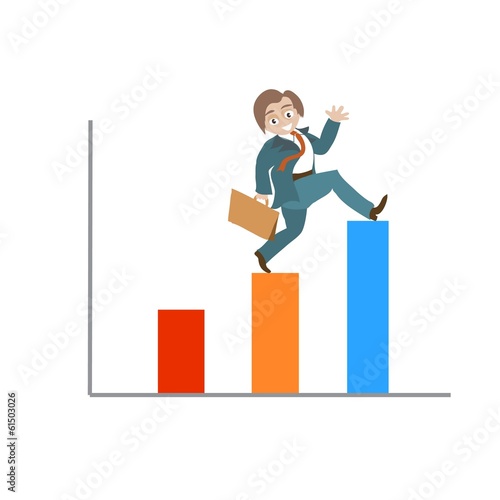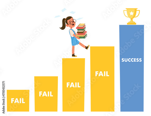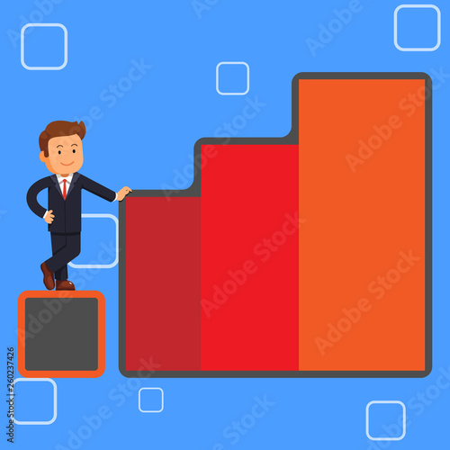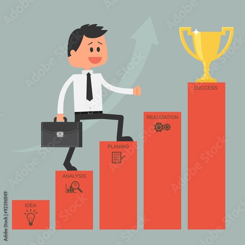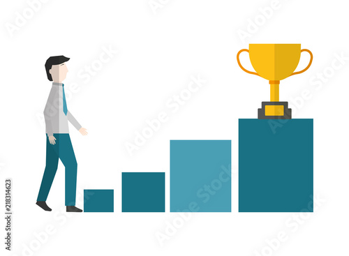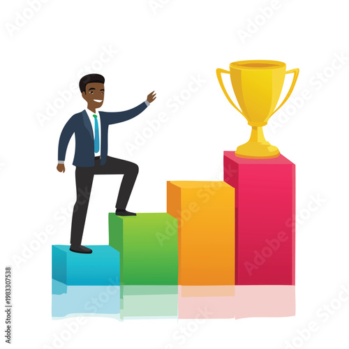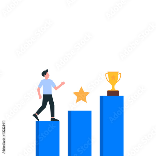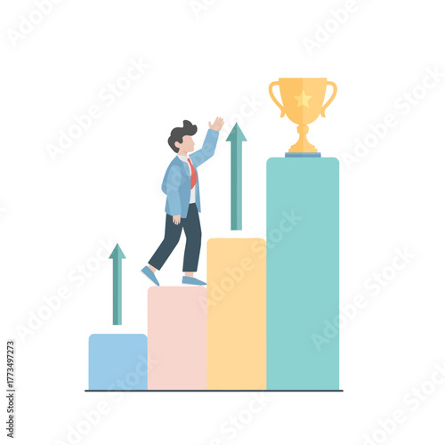 Бизнесмен, поднимающийся по лестнице к успеху. Достижение цели. Концепция мотивации и цели для достижения успеха в бизнесе и жизни. Векторная иллюстрация в плоском дизайне.