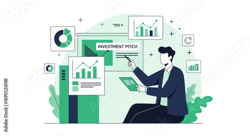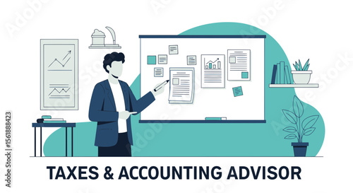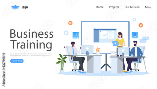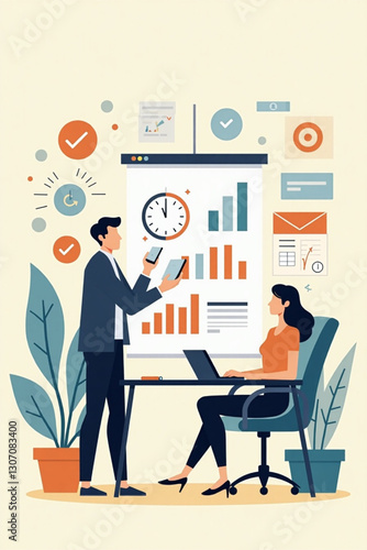Векторная иллюстрация бизнесмена, бегущего с портфелем. Современный офисный интерьер, доска для презентаций, кулер для воды. Дизайн в плоском стиле.
