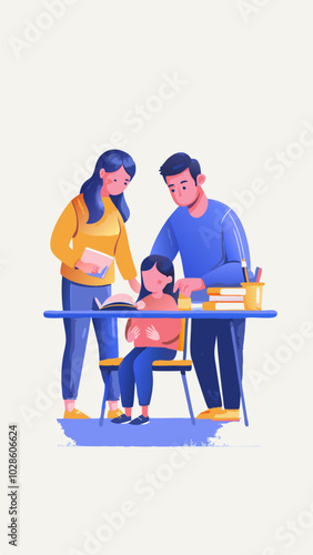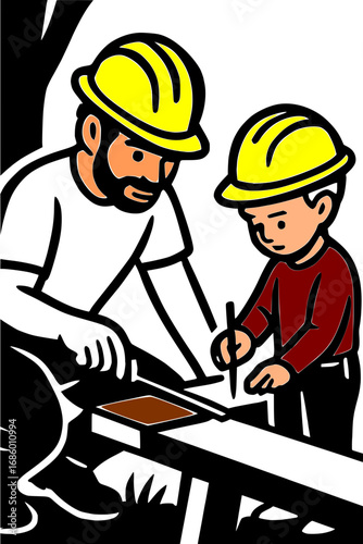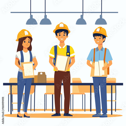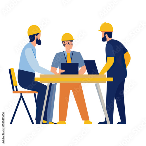 Бизнесмен-заказчик, строитель и бригадир читают векторную иконку чертежей, изолированную на белом фоне.
