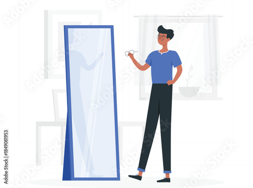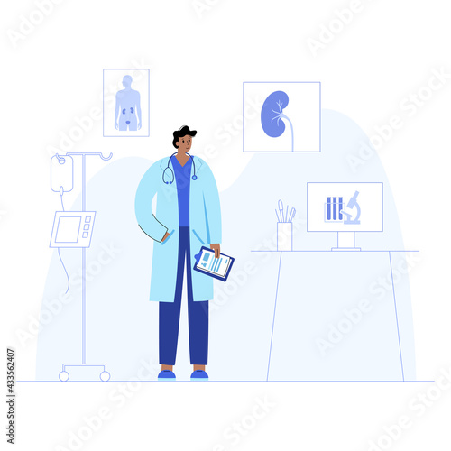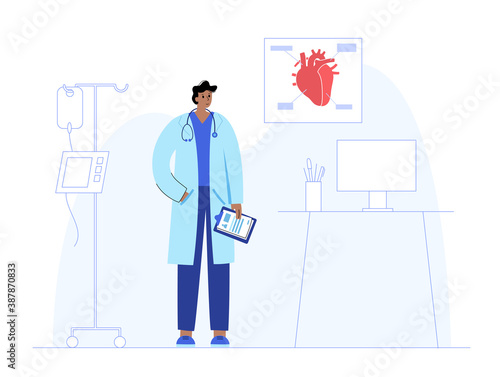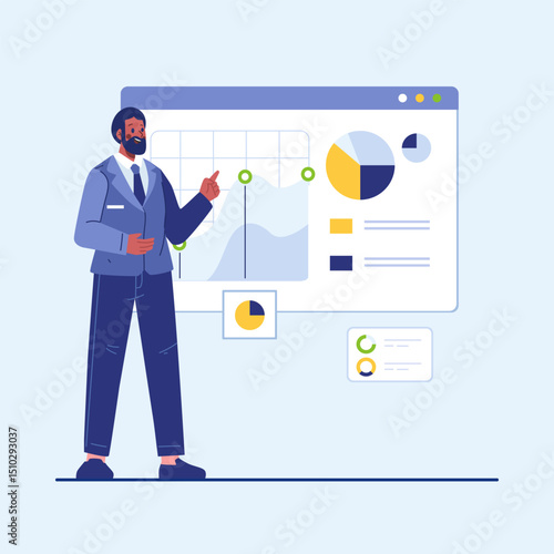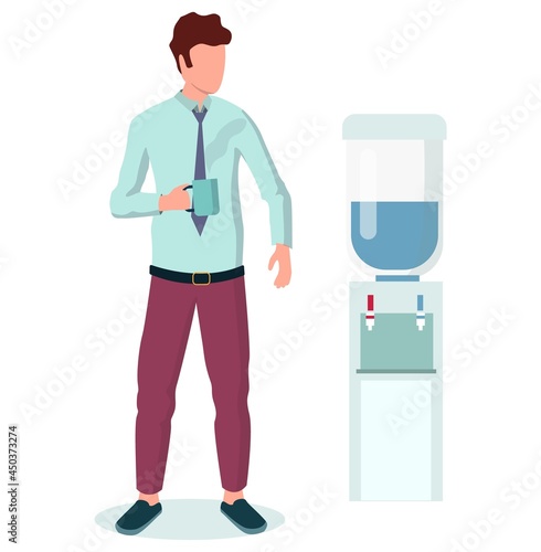 Бизнесмен пьет кофе, стоя возле кулера с водой в офисе, плоская векторная иллюстрация. Перерыв на кофе. Время чаепития. Офисный образ жизни.