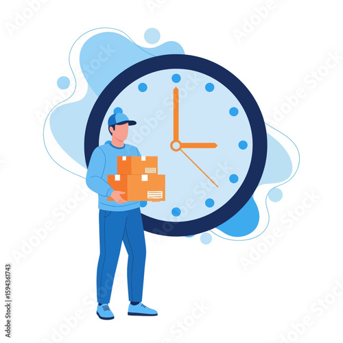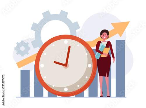 Бизнесмен, сотрудник с ноутбуком, стоящий рядом с огромными часами, плоская векторная иллюстрация. Онлайн-управление задачами, планирование расписания, самоконтроль.