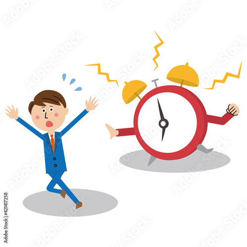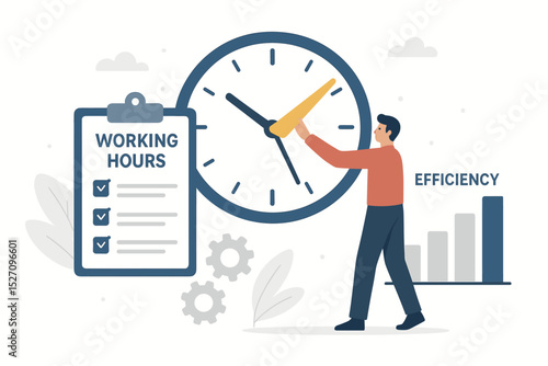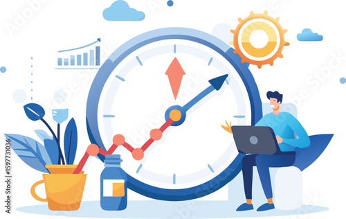 Бизнесмен, сотрудник с ноутбуком, стоящий рядом с огромными часами, плоская векторная иллюстрация. Онлайн-управление задачами, планирование расписания, самоконтроль.