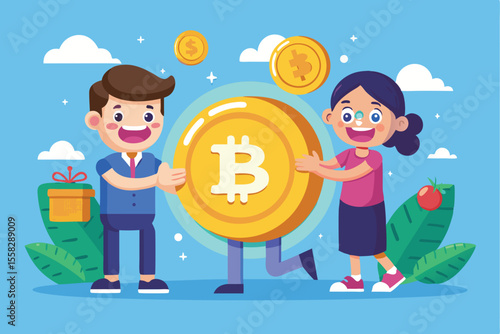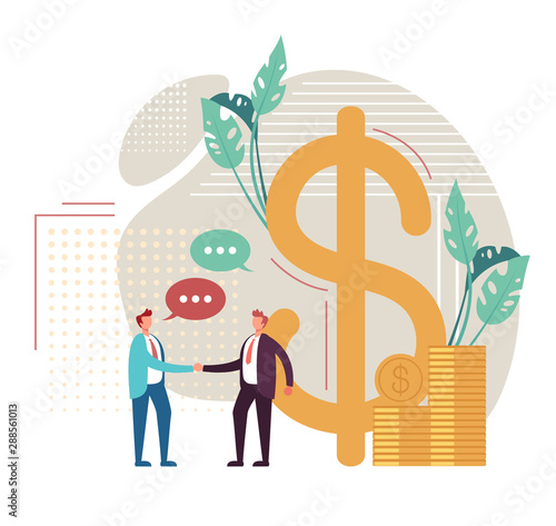 Счастливый бизнесмен, получающий кредит в банке, плоская векторная иллюстрация. Кредитное соглашение, рукопожатие банкира и заемщика, успешный личный кредит, финансовая банковская сделка, бизнес-риск.