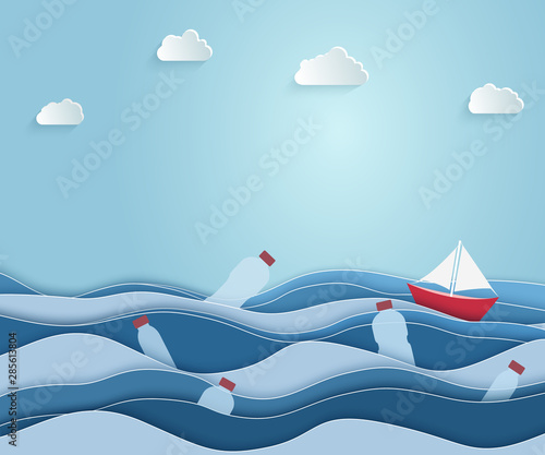 Бизнесмен в лодке, смотрящий в телескоп на вершину океанской волны во время кризиса, вызванного пандемией вируса короны, векторная иллюстрация, вырезанная из бумаги. Пандемическая бизнес-стратегия, видение, успех.