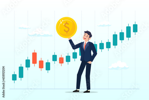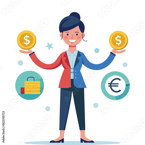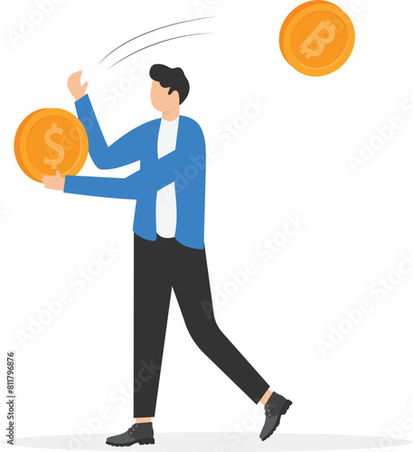 Векторная иллюстрация бизнесмена, жонглирующего золотыми монетами с символами криптовалюты. Элемент дизайна концепции бизнеса и финансов.