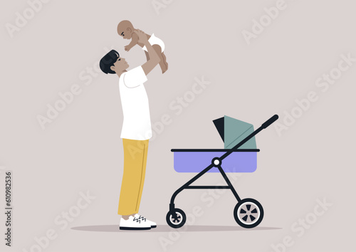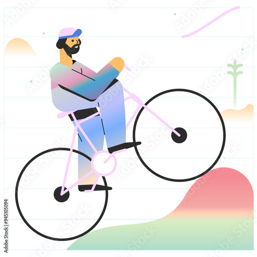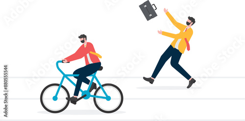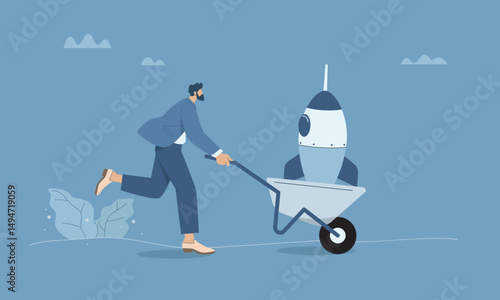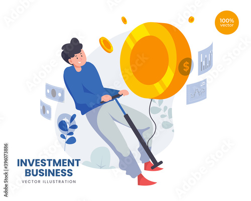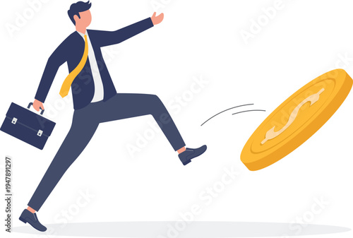 Бизнесмен толкает тачку с мешком денег, плоская векторная иллюстрация. Человек удачи, счастливый состоятельный джентльмен, богатый банкир, долларовый миллионер.