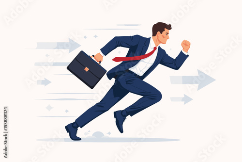 Бизнесмен, бегущий на работу, векторная иллюстрация дизайна в плоском стиле. Молодой человек в костюме, с портфелем в одной руке и документом в другой. Бизнес-концепция для веб-баннера, страницы веб-сайта и т.д.