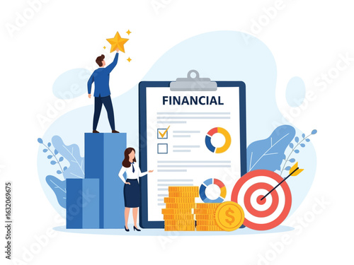 Бизнесмен, стоящий на подиуме, занявший первое место с кубком trophy award, плоская векторная иллюстрация. Бизнес-лидер, чемпион, празднование победы.