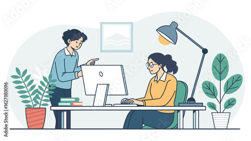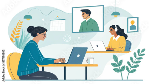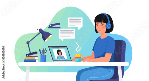 Бизнесмен разговаривает со своим коллегой онлайн с помощью компьютера, сидя за столом в офисе, плоская векторная иллюстрация. Удаленная работа, домашний офис, коммуникационные технологии онлайн-чата. Вебинар, фриланс.