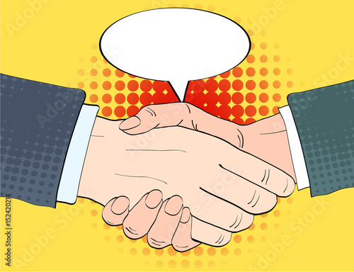 Бизнесмены пожимают друг другу руки векторная иллюстрация в стиле ретро поп-арт. Концептуальный плакат с партнерским рукопожатием в комическом дизайне.
