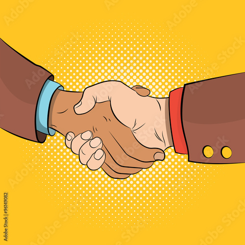 Бизнесмены пожимают друг другу руки векторная иллюстрация в стиле ретро поп-арт. Концептуальный плакат с партнерским рукопожатием в комическом дизайне.