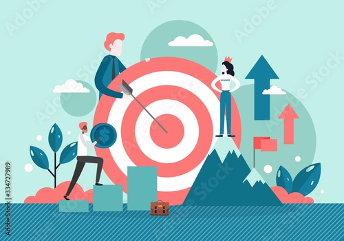 Занятые сотрудники, выполняющие задачи, держащие круговую диаграмму, мегафон, цель, календарь, плоскую векторную иллюстрацию. Офисные люди, занятые работой. Эффективность, продуктивность, управление задачами.
