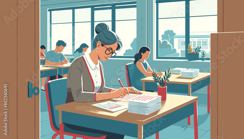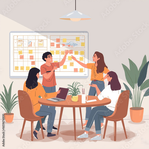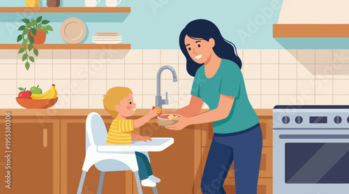 Занятая мать с ребенком работают и учатся дома. Женщина кормит своего ребенка и одновременно работает на компьютере. Векторный плакат концепции работающей мамы. Материнство и карьера.