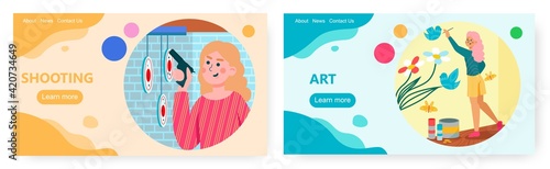 Занятая женщина досуг дизайн целевой страницы, набор шаблонов веб-сайта, плоская векторная иллюстрация. Счастливые девушки наслаждаются любимыми увлечениями. Женские персонажи посещают спортивно-дамский тир и арт-клуб.