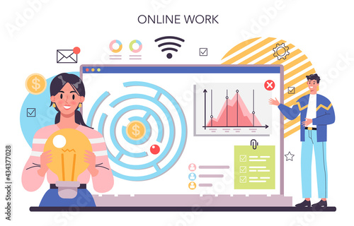 Занятая женщина работает с ноутбуком в домашнем офисе, в то время как отец заботится о ребенке. Иллюстрация концепции семейного отдыха дома. Векторный шаблон дизайна веб-сайта. Работающая мать.