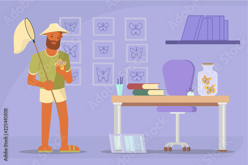 Бородатый мужчина собиратель бабочек или ловец с сачком для бабочек. Векторная иллюстрация в плоском стиле. Элемент дизайна концепции хобби по коллекционированию бабочек.