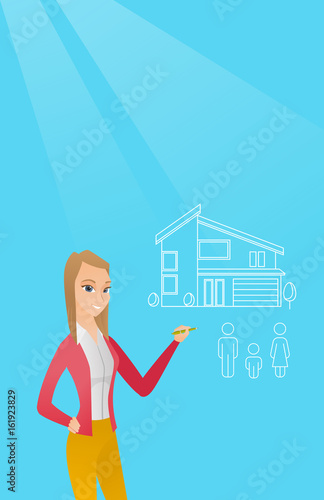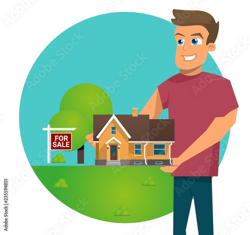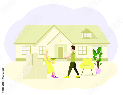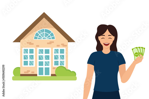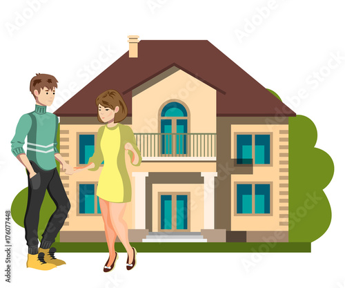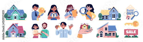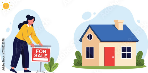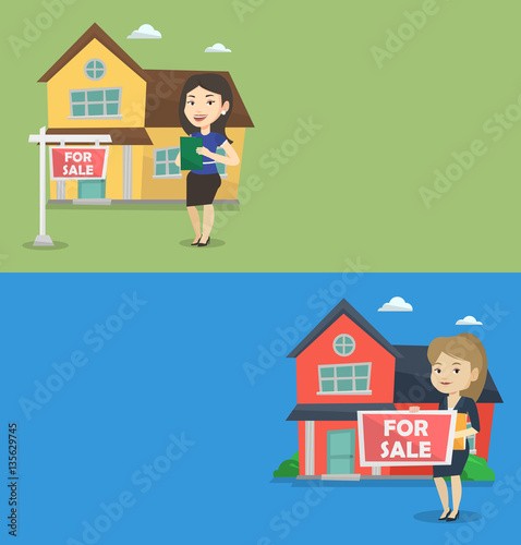 Благополучие и счастье. Дизайн целевой страницы, набор шаблонов баннеров веб-сайта, плоская векторная иллюстрация. Счастливая женщина покупает дом, а счастливый мужчина ужинает в ресторане.