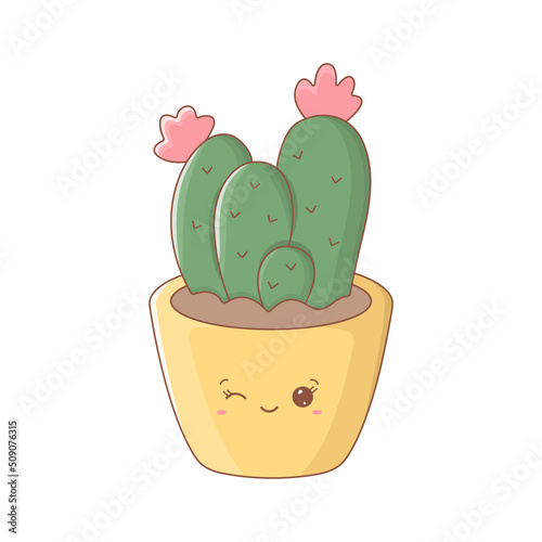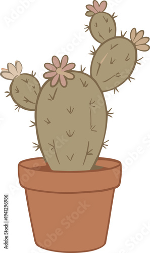 Векторная иллюстрация цветка кактуса. Мультяшное растение. Кактус в горшке на иконке. Суккулент с шипами и распускающимся бутоном в цветочном горшке, изолированный на белом фоне