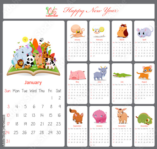 векторный шаблон ежегодного календаря на 2019 год с форматом воскресенье-суббота и милыми животными пандой, енотом, лисой и цветочным дизайном.