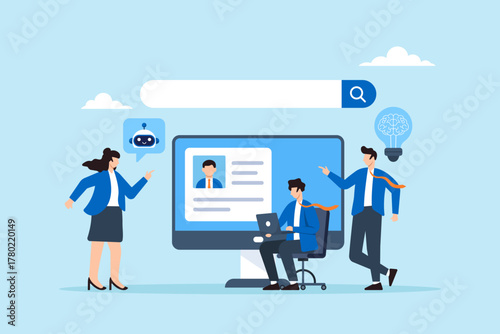Векторная иллюстрация большого монитора компьютера с агентом колл-центра в гарнитуре на экране, крошечные клиенты, использующие мобильные телефоны. Справочная служба, служба поддержки клиентов, техническая поддержка 24-7 для страницы веб-сайта и т.д.