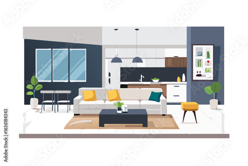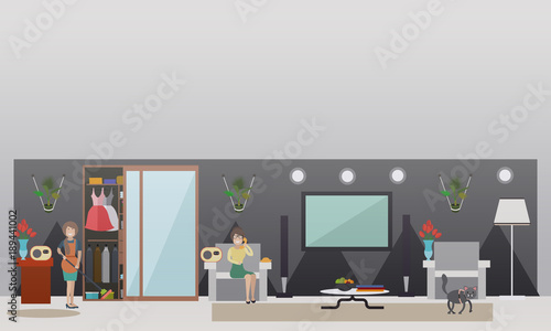 Векторная иллюстрация домохозяйки, слушающей радио во время мытья полов с помощью губчатой швабры, женщина звонит на радиостанцию, сидя на диване. Концепция радиопрограммы Call-in дизайн в плоском стиле.