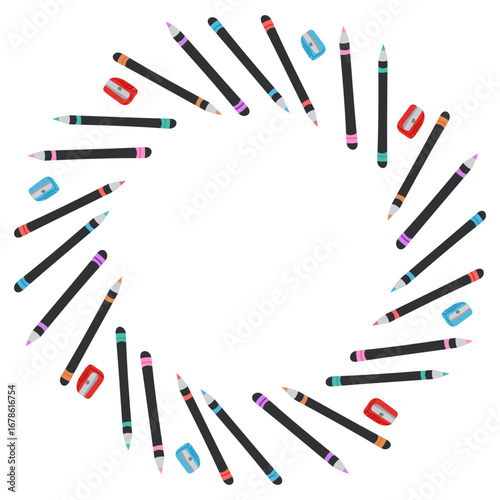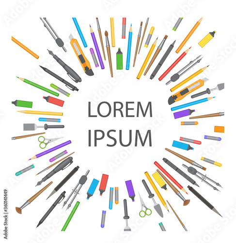 Вектор каллиграфии. Круглая рамка из иллюстрации к инструментам для письма. Гусиное перо с набором наконечников, авторучка, карандаш, кисть и артбук для практики письма реалистичный дизайн