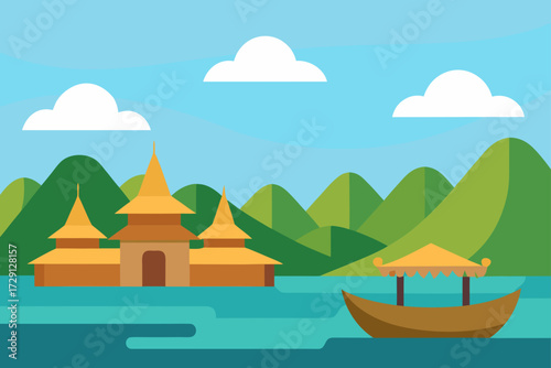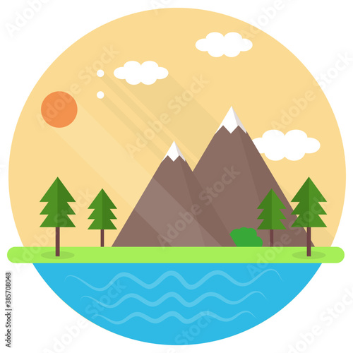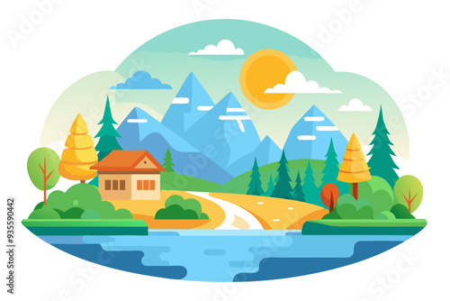 Векторное искусство вырезания из бумаги оригами в горном лагере. Фон летнего путешествия создает 3d-пейзаж. Иллюстрация дизайна горы, елового леса и туристической палатки