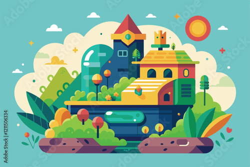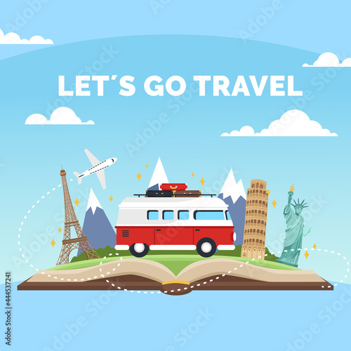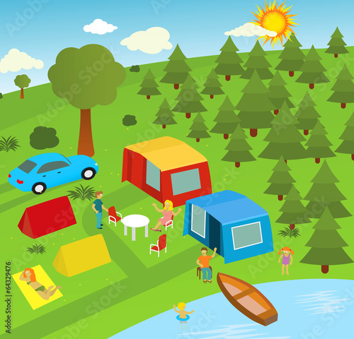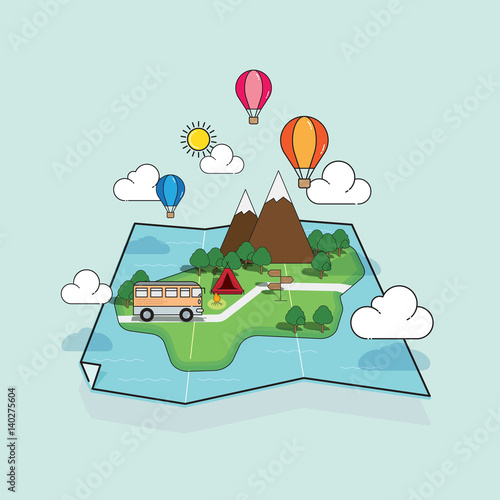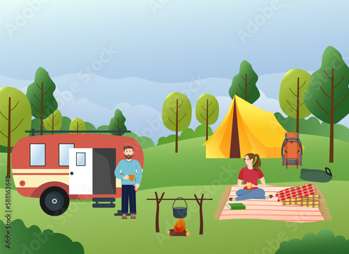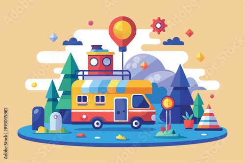 Фургон-кемпер с велосипедом на крыше. Путешествия и кемпинг изометрическая векторная иллюстрация в плоском 3d стиле. Деятельность в лагере на открытом воздухе. Путешествуйте на автомобиле-фургоне.