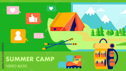Кемпинг в парке объектов на экране мобильного телефона. Векторная иллюстрация в плоском 3d-стиле. Лагерь на открытом воздухе в парке. Оставайтесь онлайн везде, где есть концептуальная иллюстрация.