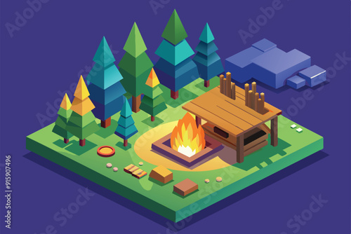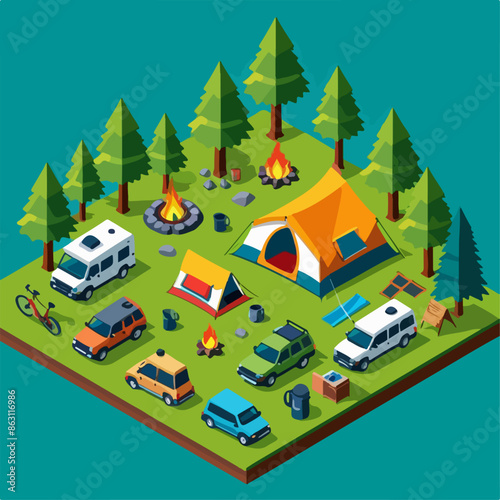 Изометрическая концепция кемпинга. Векторная иллюстрация в плоском 3d-стиле. Деятельность в лагере на открытом воздухе. Путешествие на кемпере в горах.