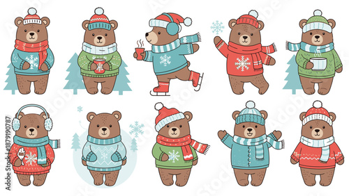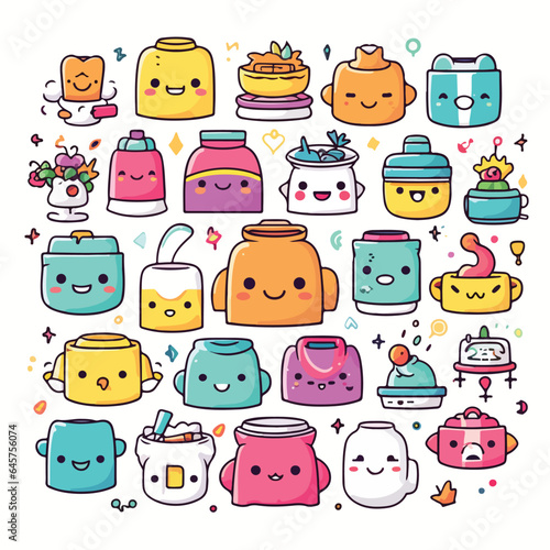Набор векторных принадлежностей для кемпинга. Милый мультяшный персонаж, изолированный на белом фоне. Рюкзак, бутылка с водой, сумка первой помощи, кружка, чайник, термос, карта, иллюстрация талисмана газовой горелки