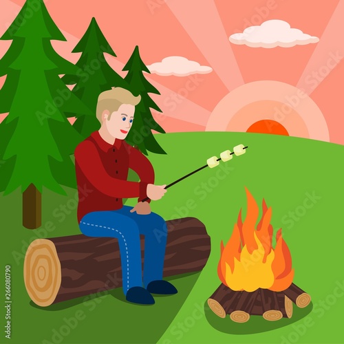 Дорожно-транспортное происшествие в кемпинге и неприятная ситуация с векторной иллюстрацией. Пострадавший путешественник попал в беду на съемочной площадке палаточного лагеря. Проблемы со здоровьем и возгорание во время прогулки на природе.